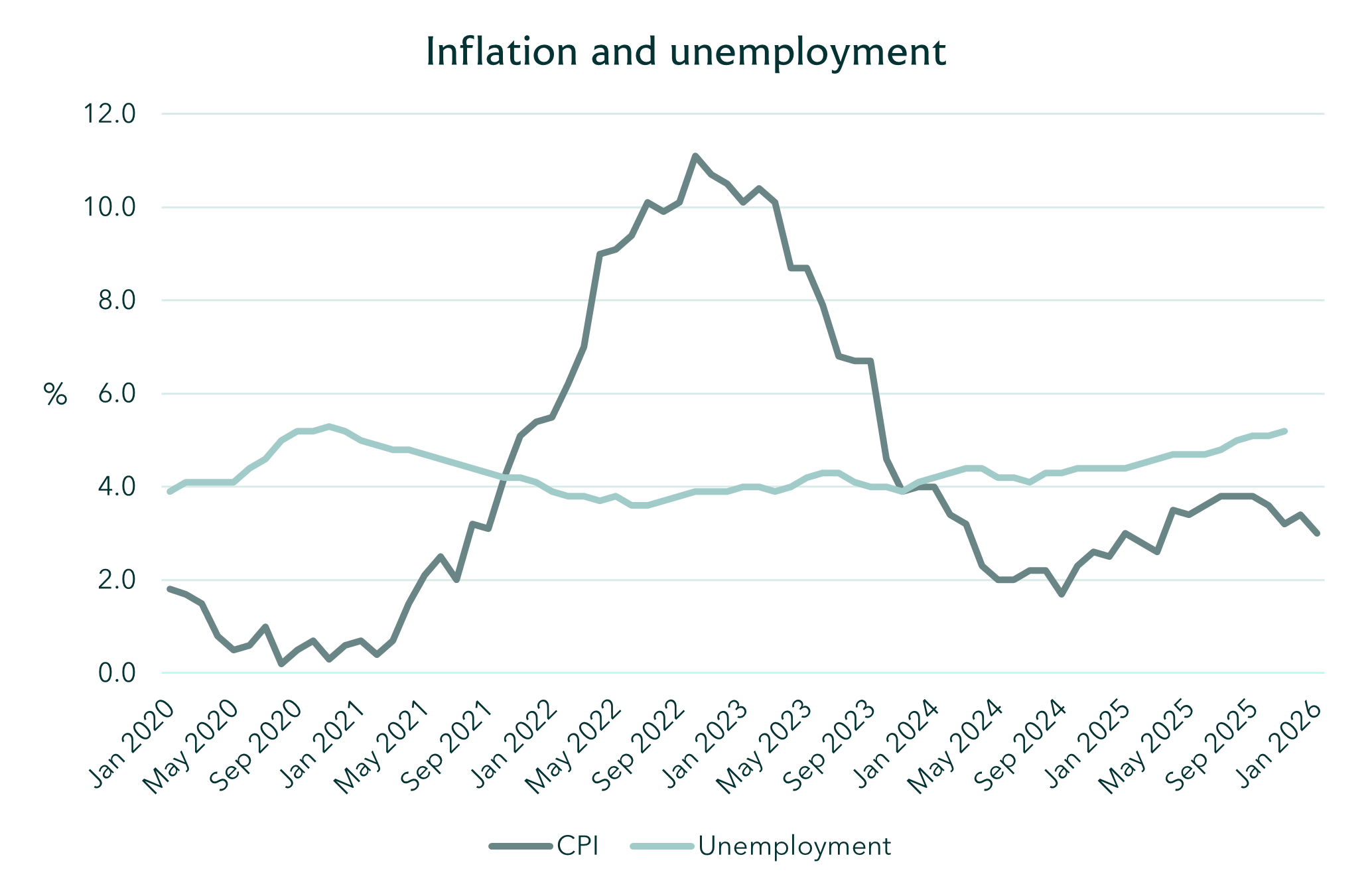 - Unemployment for October to December 2025 was 5.2%, up from 4.4% for the corresponding period a year ago and above pre-coronavirus pandemic rates. The hardest hit were those aged 16 to 24, where the unemployment rate was 16.1%, the highest for over a decade.